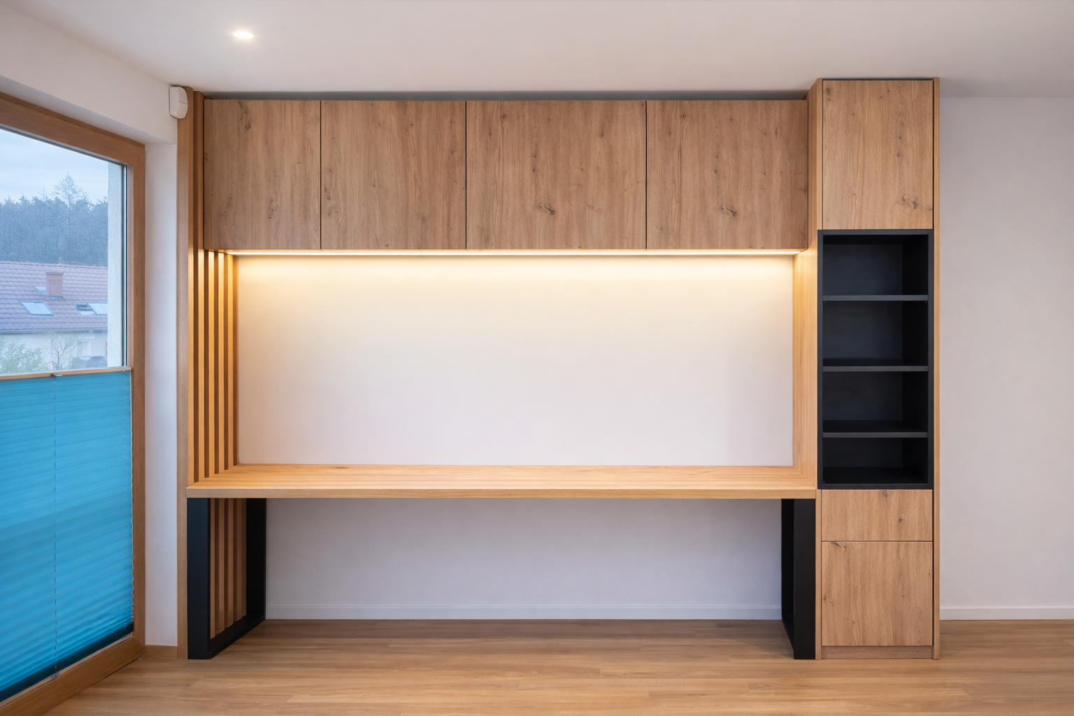 Projekt obejmuje długie biurko robocze, zabudowę górnych szafek oraz funkcjonalny regał, które zapewniają dużą ilość miejsca do przechowywania oraz komfort podczas codziennego użytkowania. Dodatkowym elementem są dekoracyjne lamele ścienne oraz oświetlenie LED, które nadają całości nowoczesnego charakteru i podkreślają naturalną strukturę drewna.
