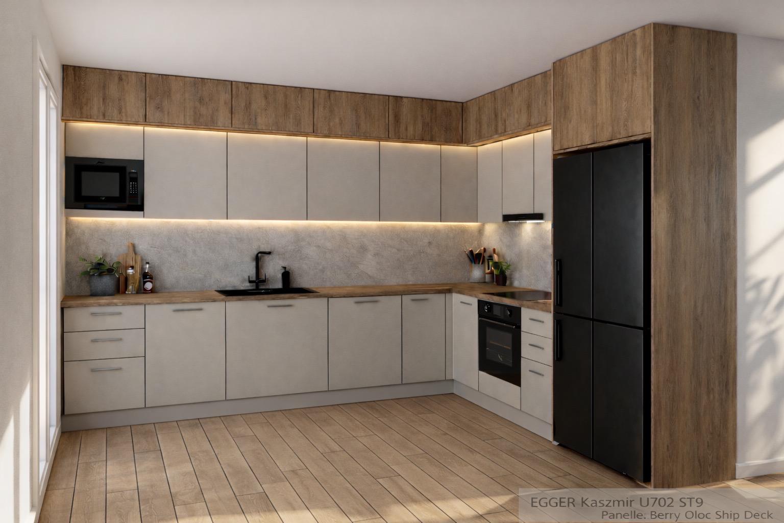 Zabudowa kuchenna to połączenie najwyższej jakości materiałów oraz naturalnych, ziemistych kolorów.
