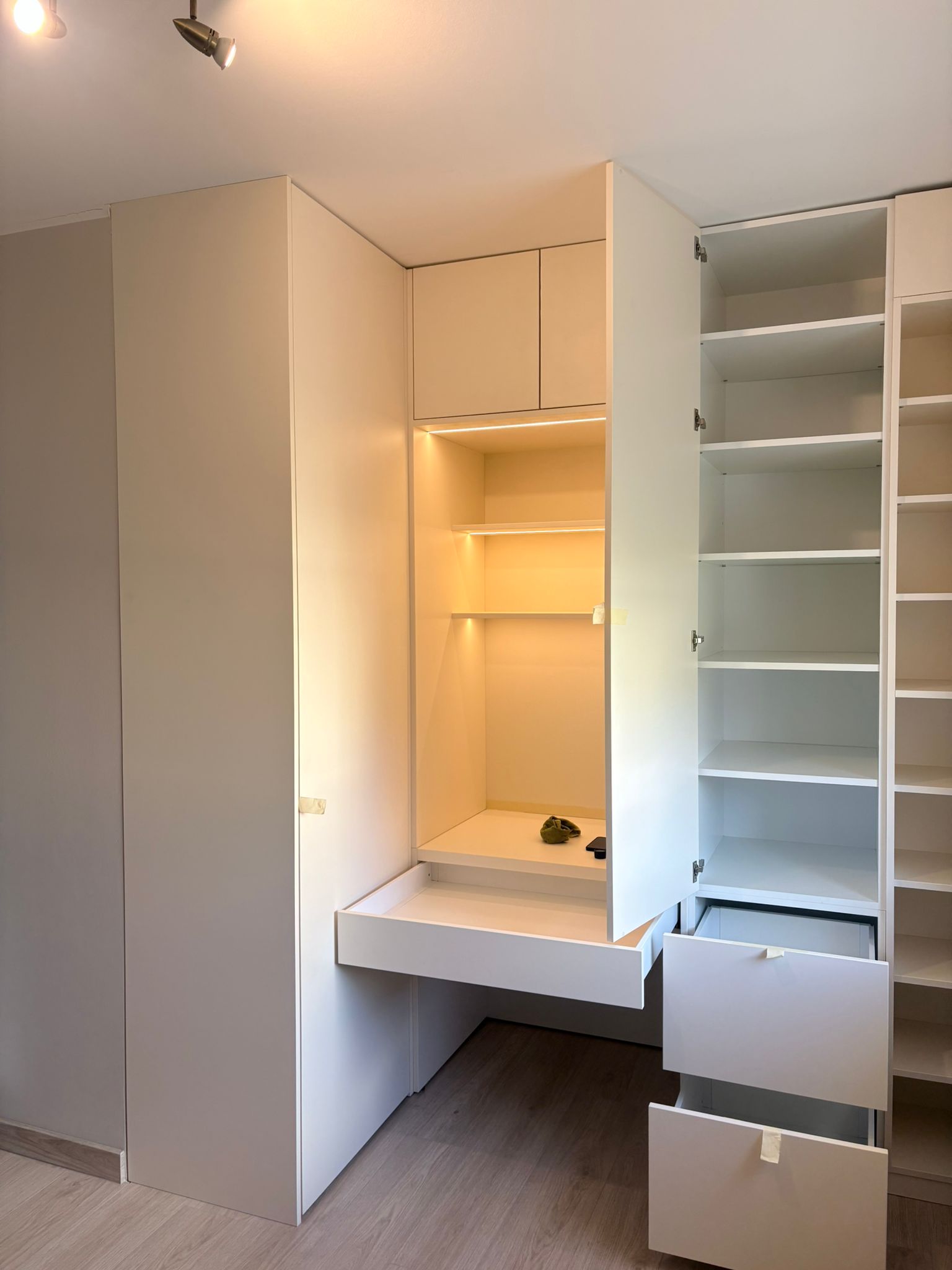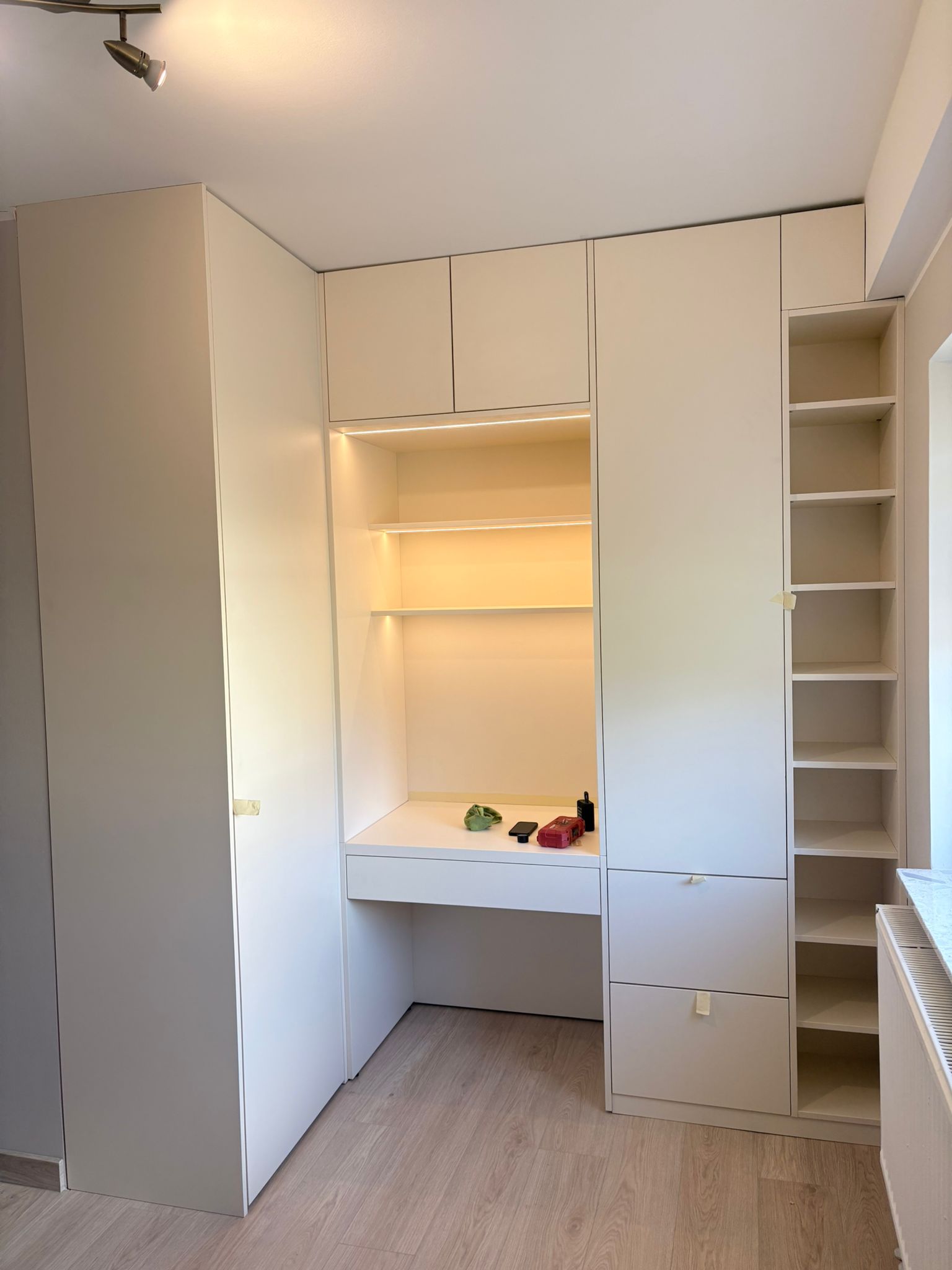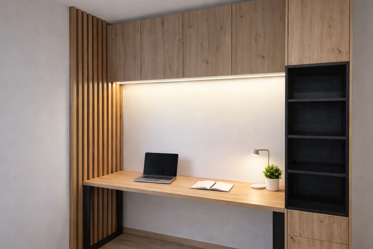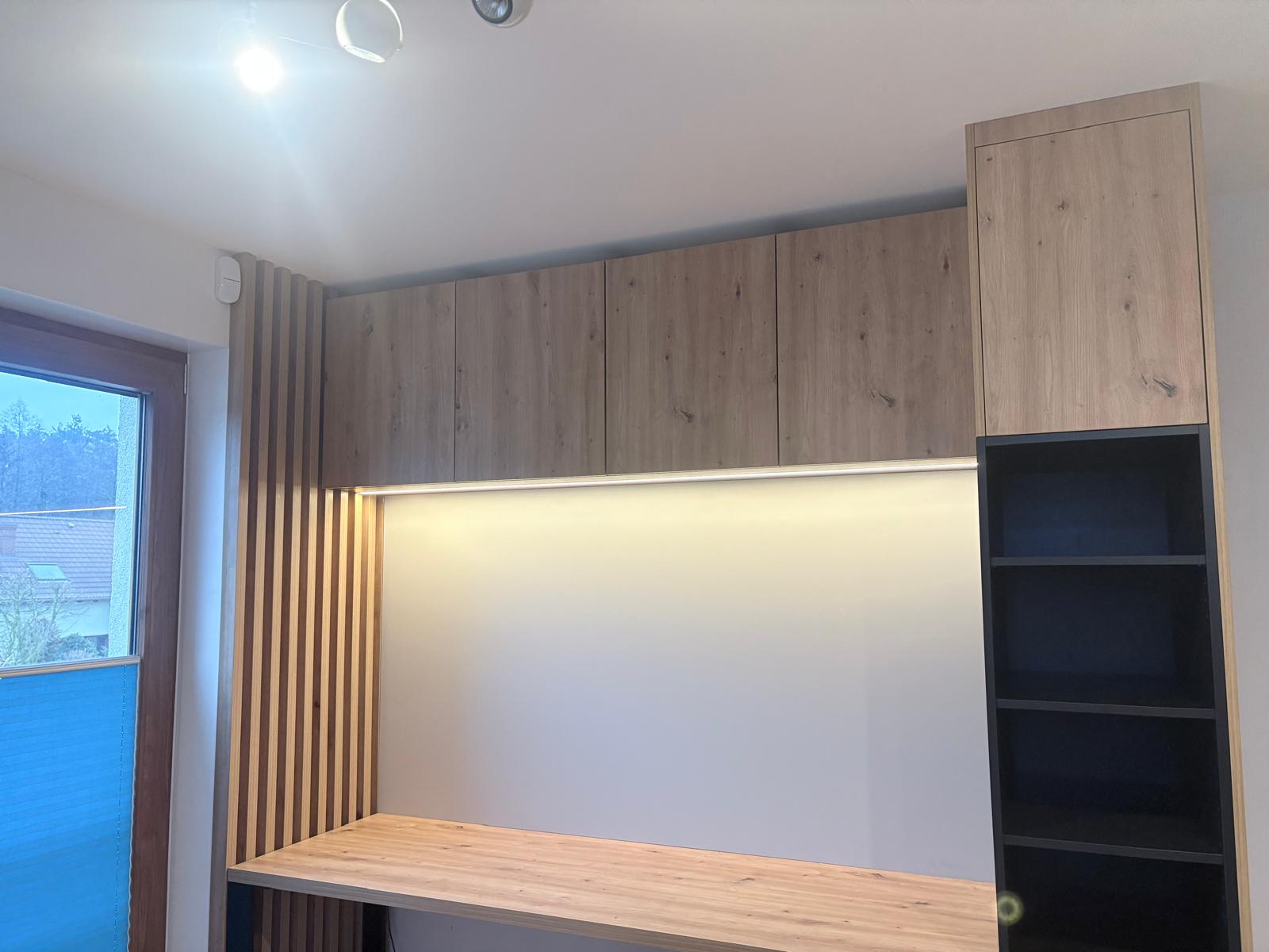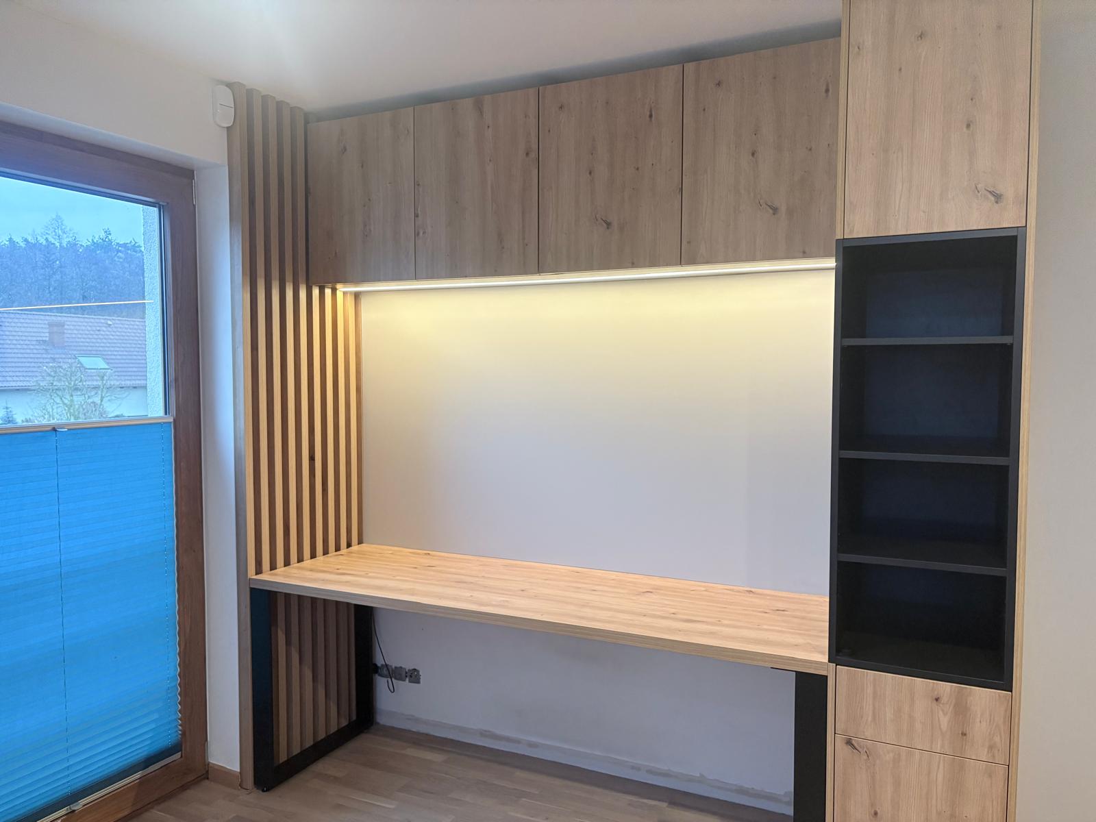 W tej realizacji wykonaliśmy zabudowę biurka na wymiar w Palędziu, dopasowaną do przestrzeni pracy i nauki. Projekt został przygotowany indywidualnie, aby zapewnić wygodne miejsce do pracy oraz funkcjonalną przestrzeń do przechowywania.